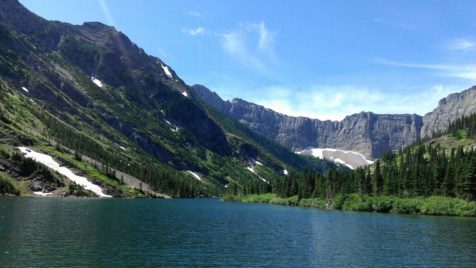 | Our second hike in Glacier centered around Lake McDonald, which is as gorgeous as it comes. The bright teal color of the water comes from fine dust that has been ground up and deposited by glaciers. Additionally, the water was remarkably clear, as you can see rocks for multiple meters from the shoreline. |